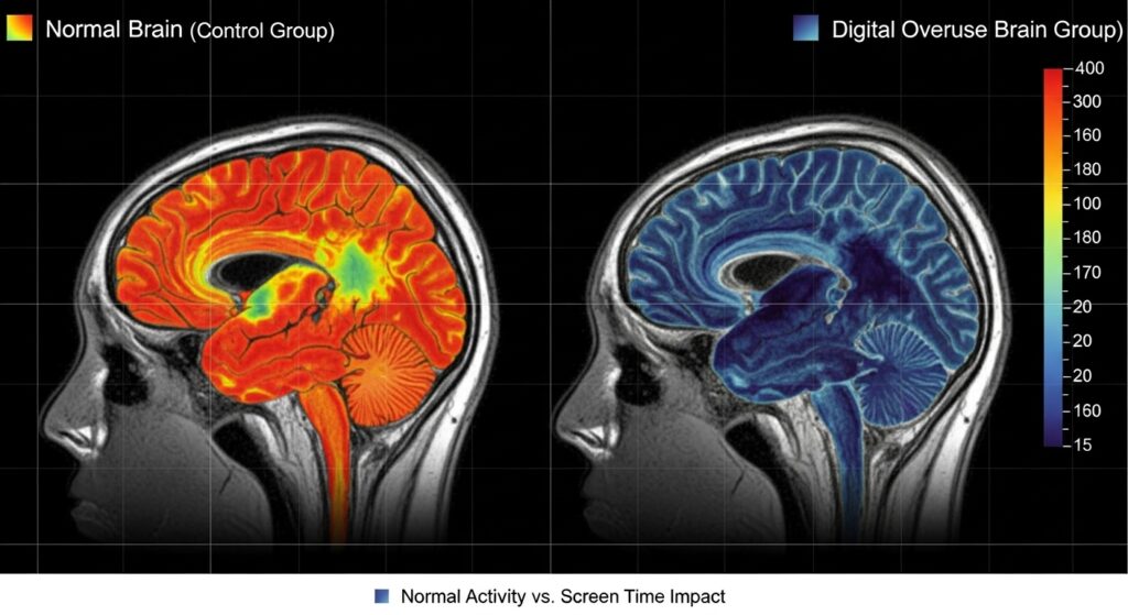 - 示唆された現象: スマホやインターネットの長時間利用は、特に9歳から18歳頃の成長期の子どもの脳で、この前頭前野などの広範な領域の萎縮(発達の遅れや抑制)と関連がある可能性が示唆されています。